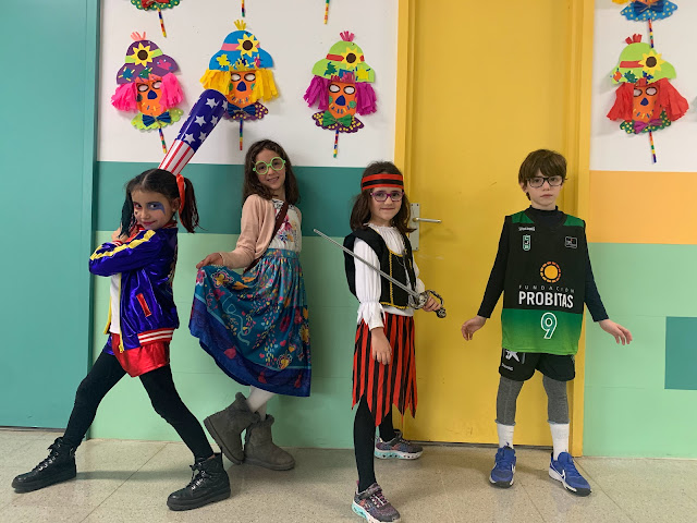 Avui hem celebrat el Carnaval a l'escola i tots molt ben disfressats hem vingut. Encara que no hem pogut fer la rua perquè plovia, ens ho hem passat d'allò més bé.